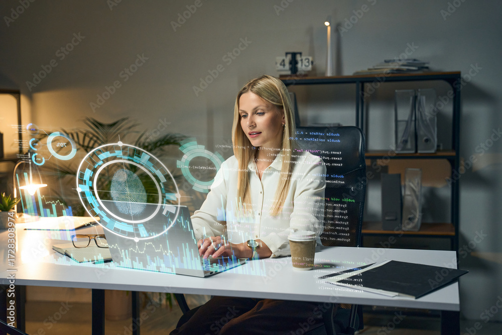 Professional Woman Analyzing Data On Laptop With Futuristic Holographic Visualization In Modern Office Setting
