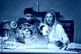 Team Of Data Analysts Collaborating With Holographic Interface And Digital Analytics In Office Workspace Environment