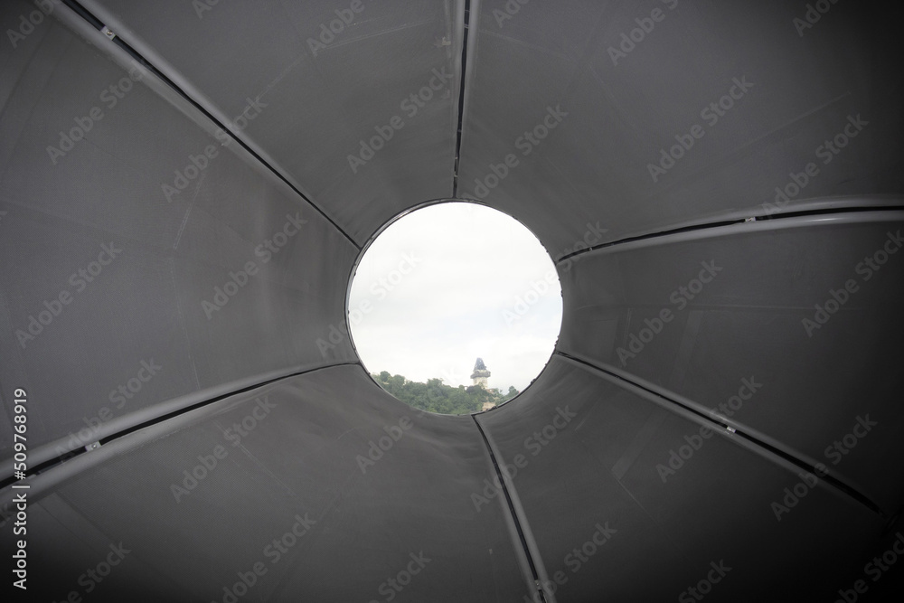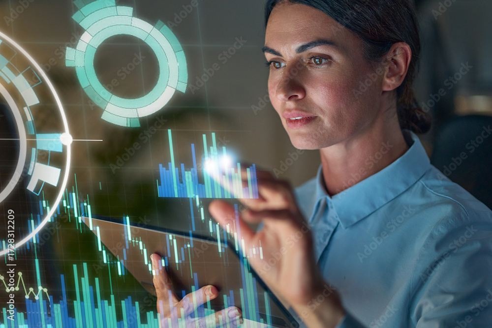 Businesswoman Analyzing Data On Tablet Behind Futuristic Holographic Security Interfaces With Analytics Charts And Global Metrics