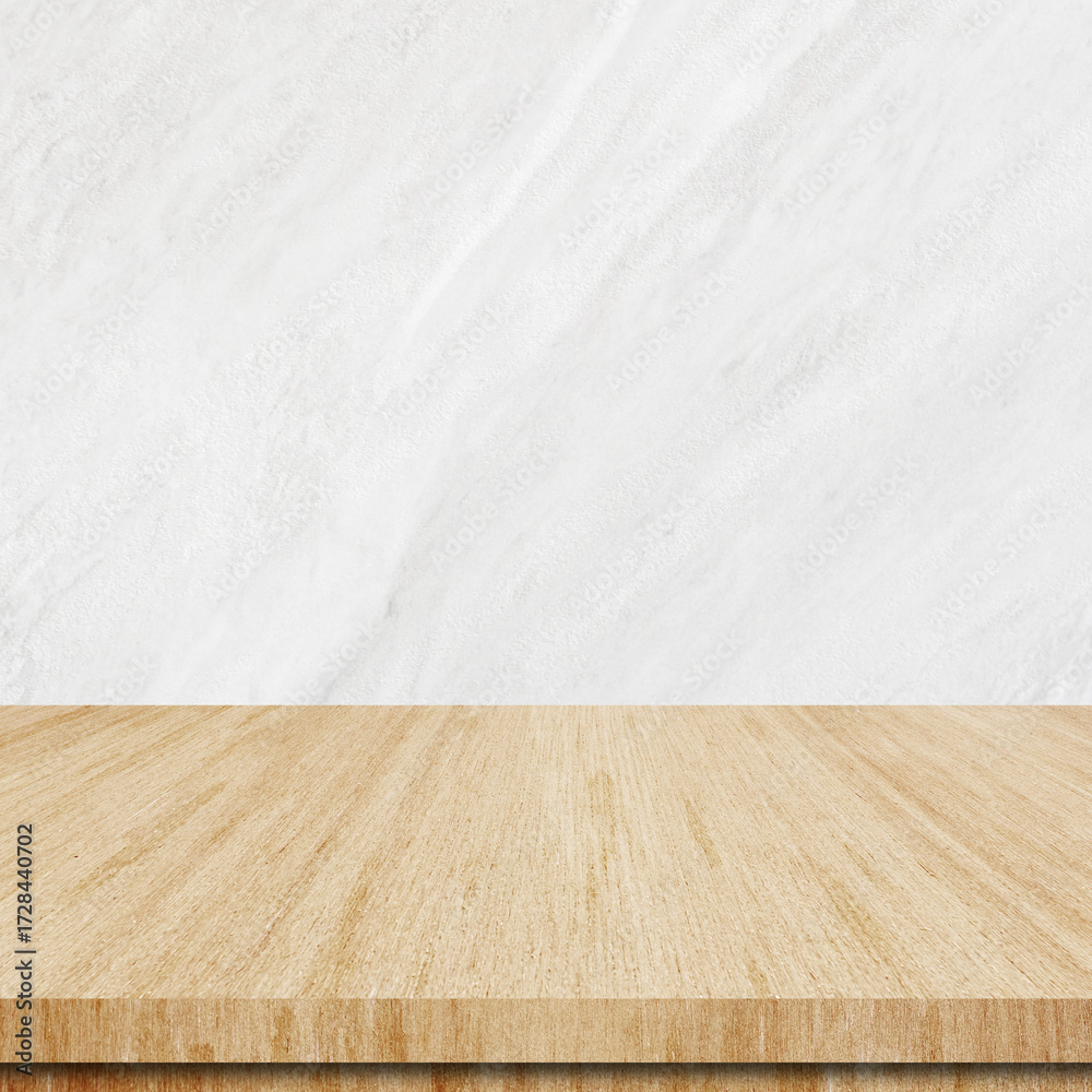Wood table and white marble wall background in kitchen, Wooden shelf, counter for food and product display in room background, Wood table top, desk surface banner, mockup, template