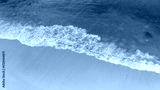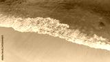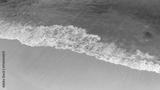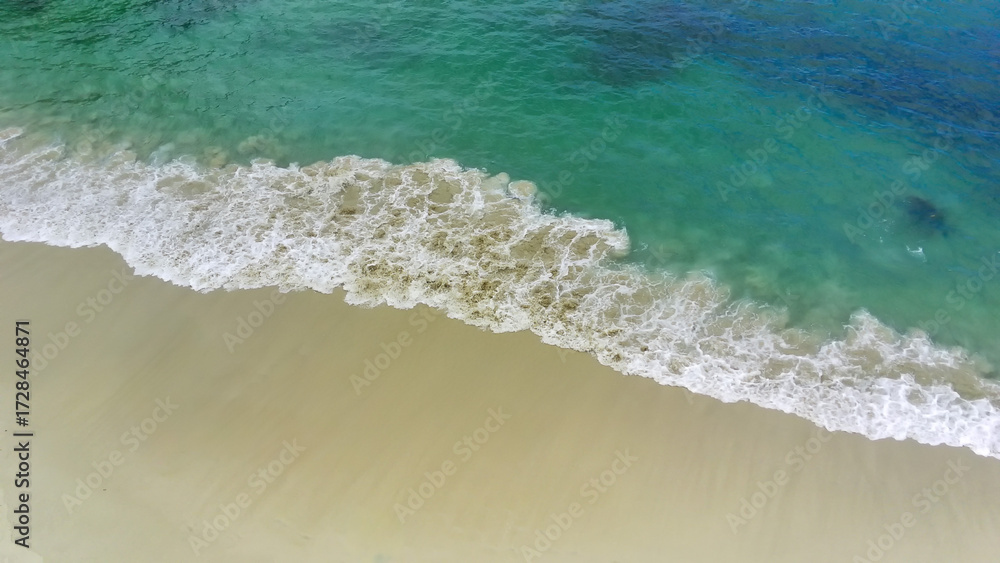 Tranquil tropical beach scene from above, featuring waves meeting golden sand.