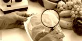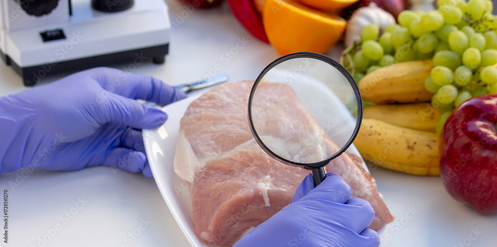 Meat and Food Quality Control Laboratory Testing with a Magnifying Glass