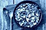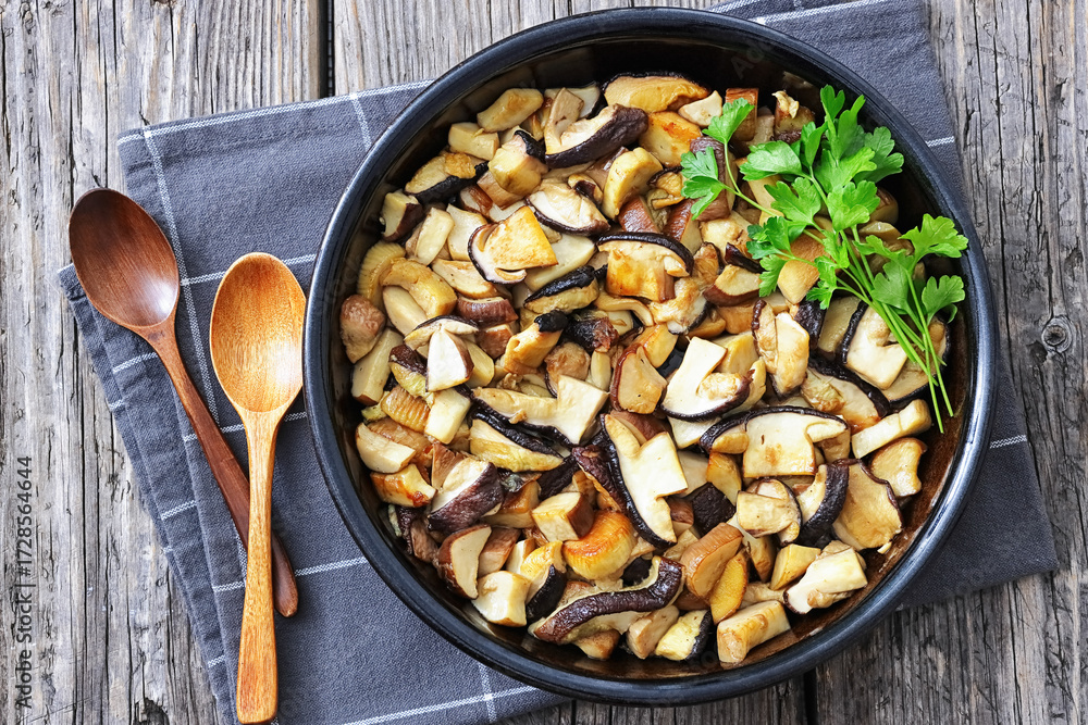 fried wild porcini mushrooms, ceps in a black bowl