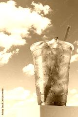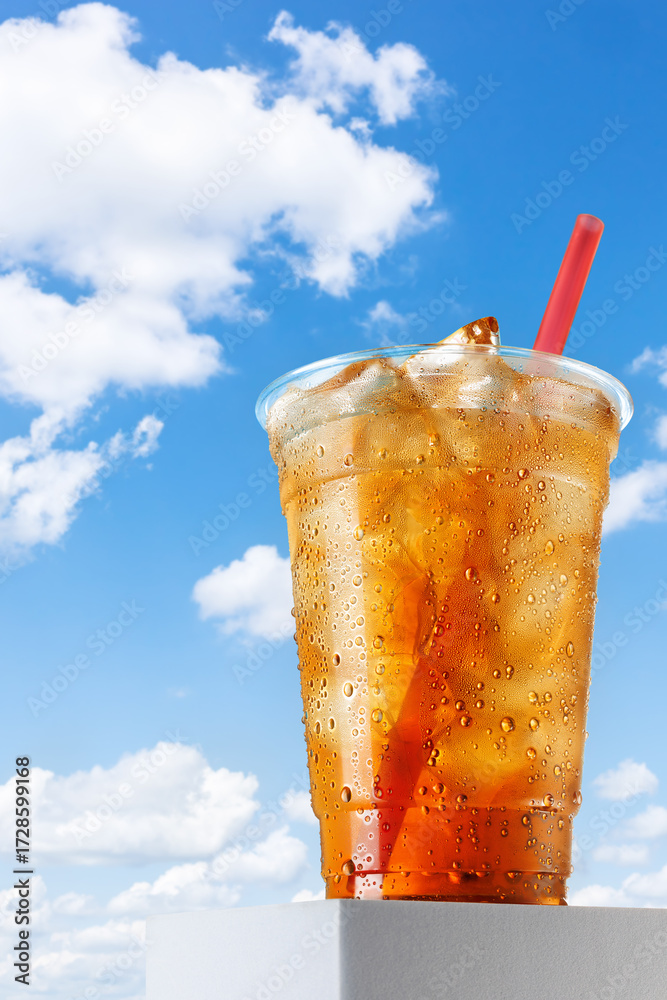 Misted disposable plastic cup with iced tea and straw stands on base against blue sky