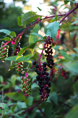 Phytolacca americana branches with green and purple fruits against sunlight . Pokeweed plant in the garden on summer