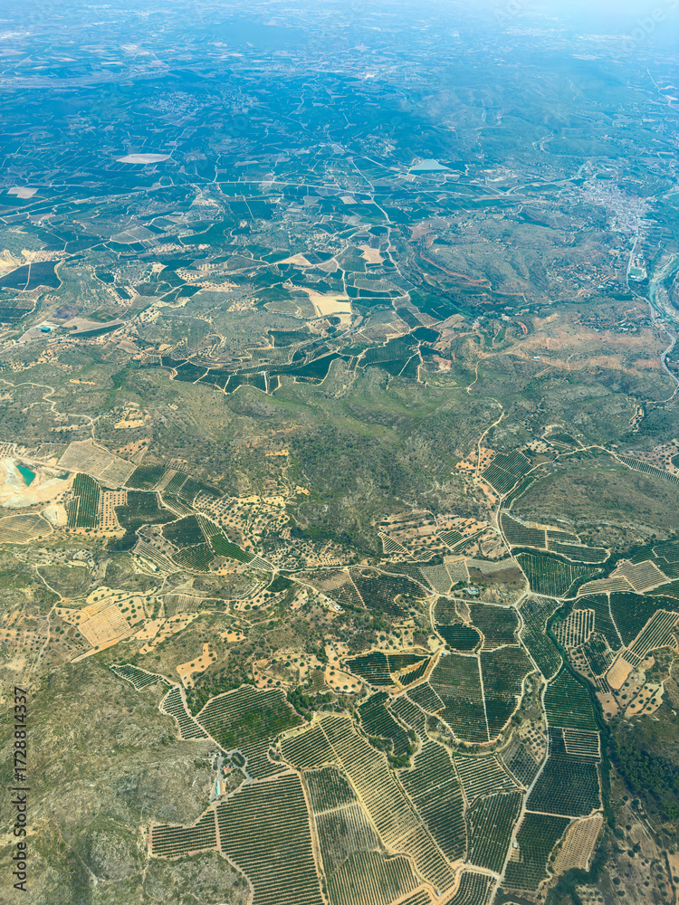 Majestic aerial view of rolling hills and vineyards under a bright blue sky in a scenic rural landscape during midday