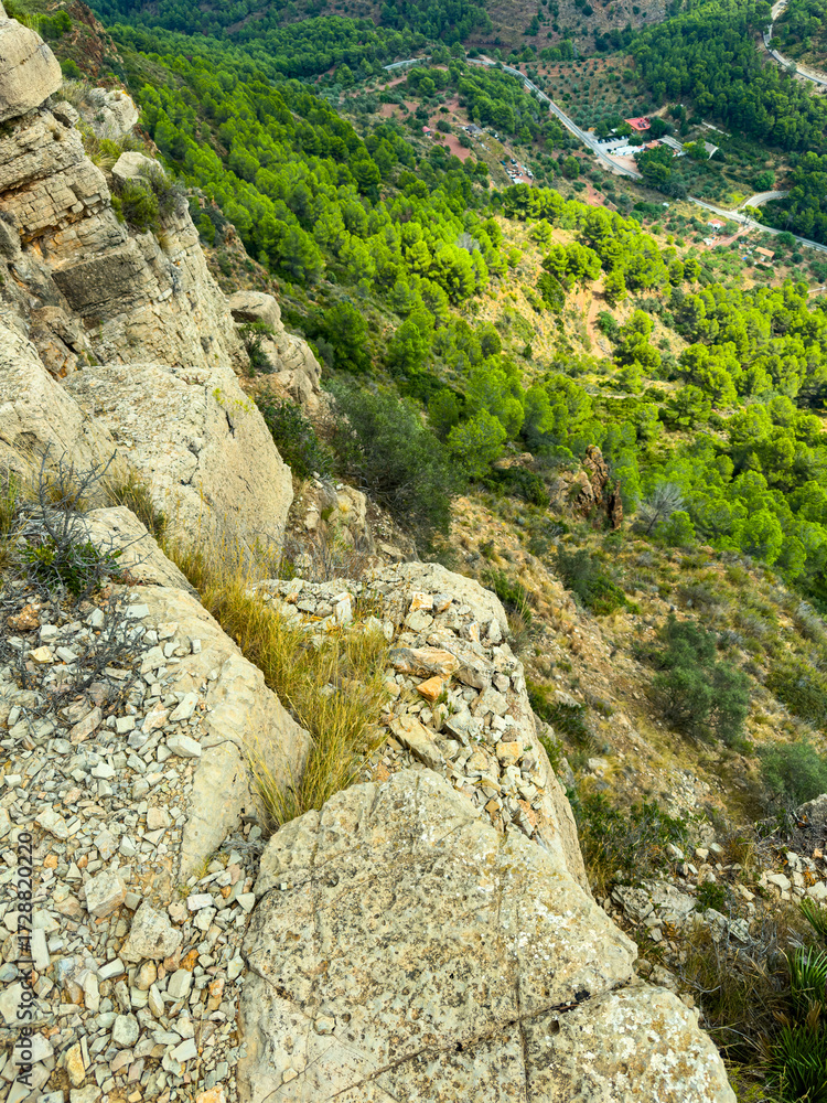Lush green valley beneath steep rocky cliffs during a bright day in a serene mountain landscape
