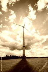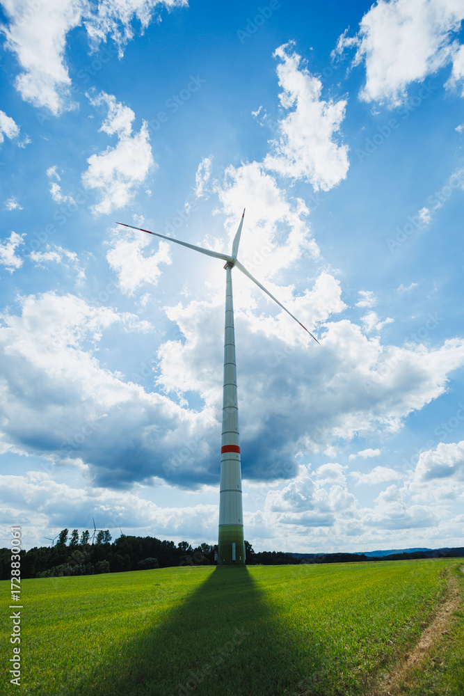 Majestic wind turbine stands tall under the expansive blue sky with puffy clouds, casting a long shadow on the vibrant green field below