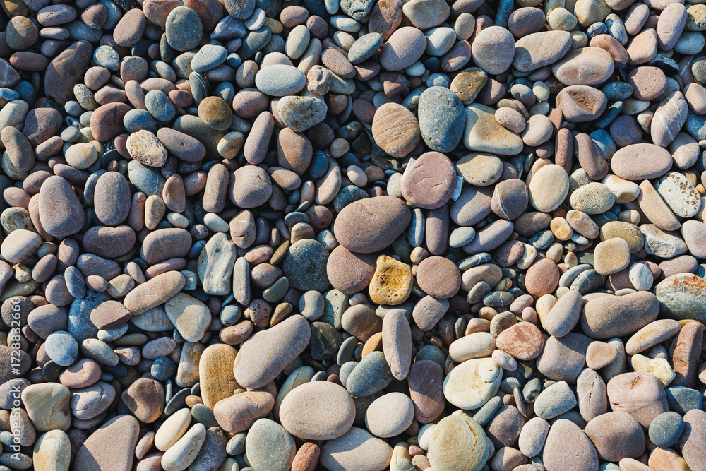 Varied colors and shapes of smooth pebbles covering a beach in bright sunlight highlighting natural textures and patterns