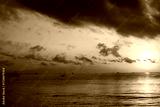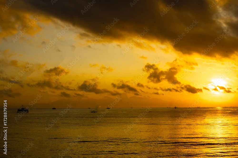 Tranquil dawn seascape. Beautiful sunrise over the sea, featuring traditional fishing boats catching the first light.