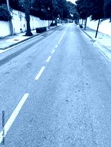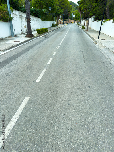 Quiet street lined with palm trees in a serene neighborhood during mid-morning