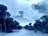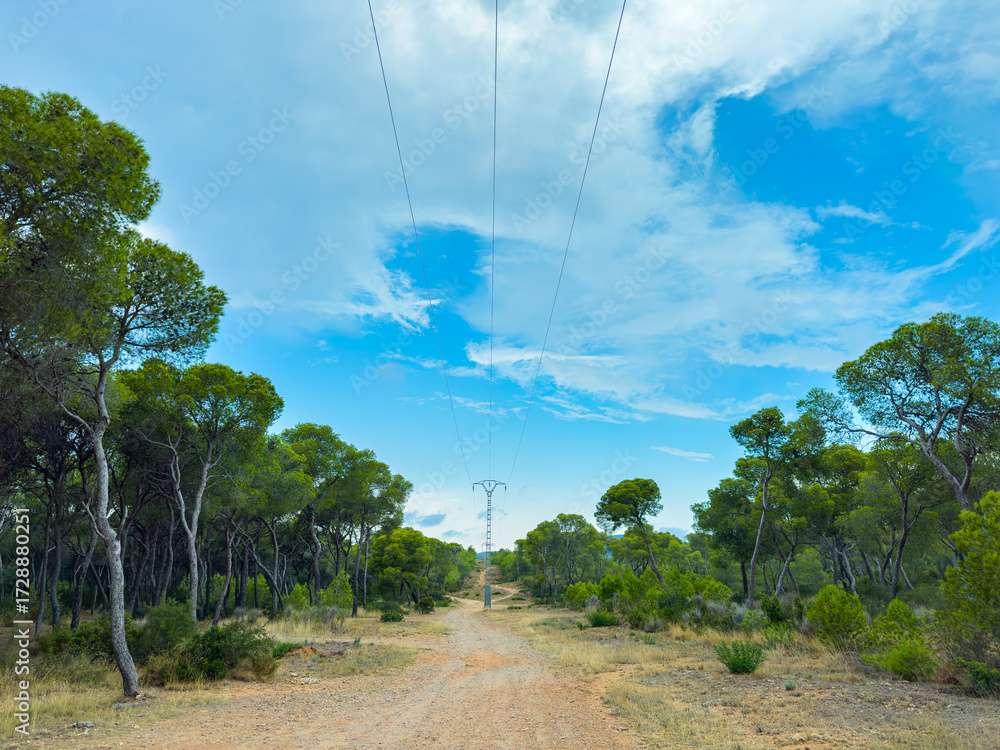 Enjoying a tranquil walk along a dirt path surrounded by tall trees under a bright blue sky with fluffy clouds