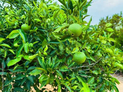 Green citrus fruits hanging on a vibrant tree in a sunny garden during late spring showcasing nature's bounty