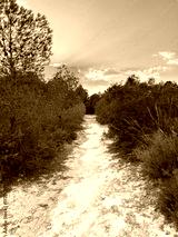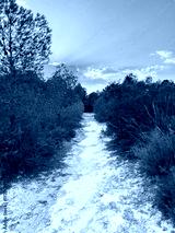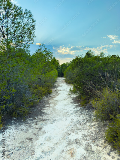 Nature trail beckons explorers with its winding path through lush green shrubs under a vibrant sky in a peaceful afternoon setting