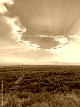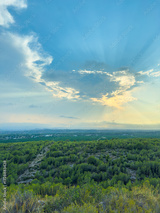 Stunning sunset over lush green hills in a serene rural landscape with dramatic clouds and rays of sunlight breaking through the sky