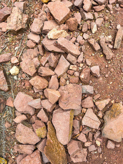 Textured landscape filled with various shades of red rocks and stones on a dry terrain in a remote outdoor location during daylight
