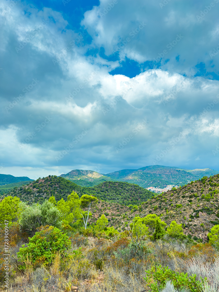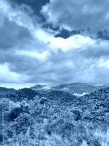 Lush green mountains under a dramatic sky filled with grey clouds on a serene afternoon