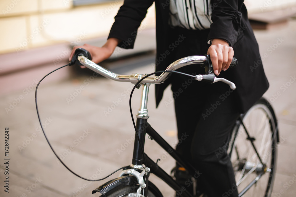 Close up photo of woman body riding on bicycle. Portrait of lady in black suit cycling along the street