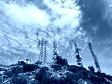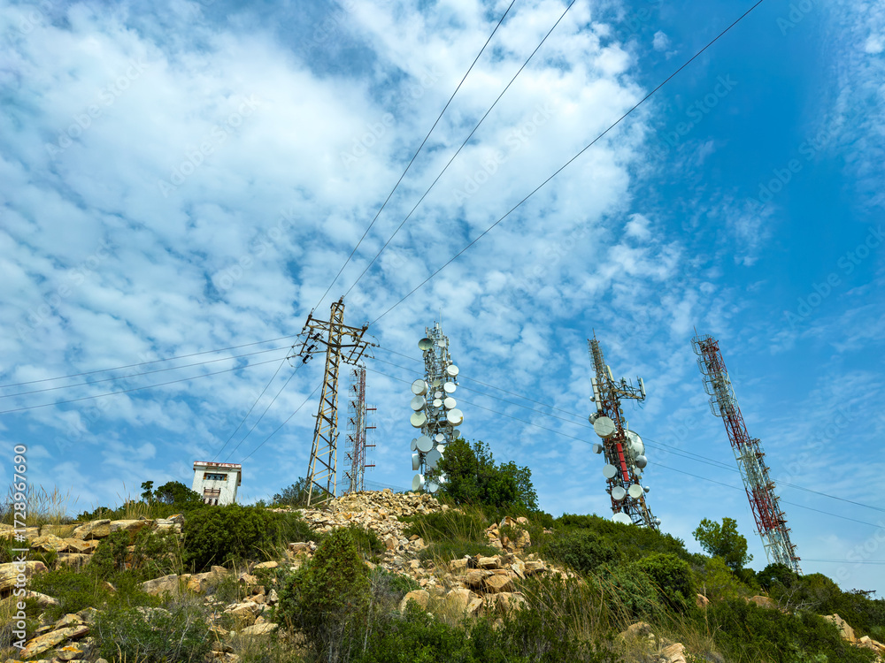 Communication towers and power lines stand tall against a blue sky with scattered clouds, captured on a sunny day in a rural area