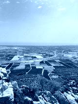 Vast countryside stretches under a clear sky with distant mountains and sparkling ocean on the horizon