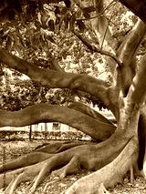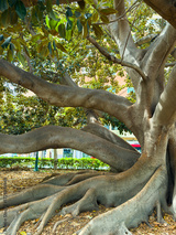 Magnificent tree with sprawling roots and lush leaves in a sunny park setting during the daytime, inviting exploration and connection with nature