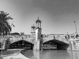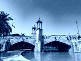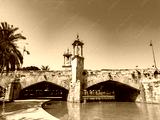 Stunning bridge with golden towers under a clear blue sky in a tranquil park setting surrounded by lush greenery