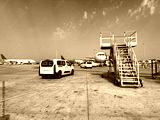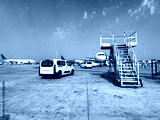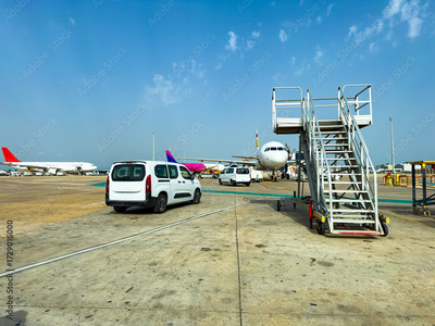 Busy airport scene showing airplanes, ground vehicles, and boarding stairs under a clear blue sky in the afternoon