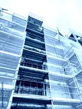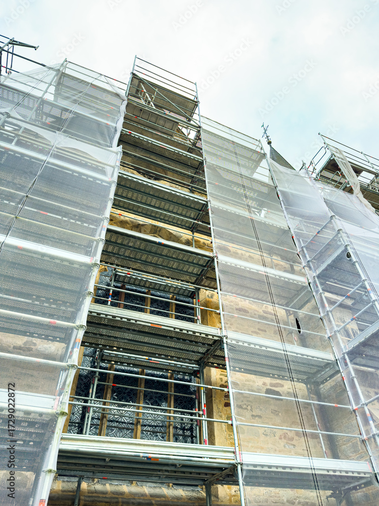 Construction scaffolding surrounds a historic building during restoration in an urban area with cloudy skies above