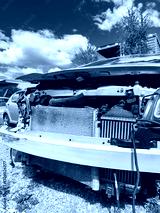 Damaged car front showing engine parts and radiator under a blue sky with clouds in a junkyard