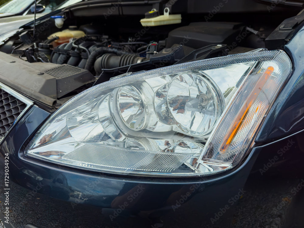 Close-up view of a car headlight showcasing its design features and intricate details in a parking lot during the afternoon