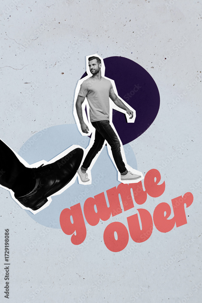3d banner sketch vertical photo collage of puzzled employee businesswoman businessman run leg kick dismissal exploitation fired