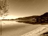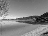 Beautiful Schliersee lake in the Bavarian Alps. Small beach along the southeast shore with views of the town of Schliersee and the slopes of the Schliesberg