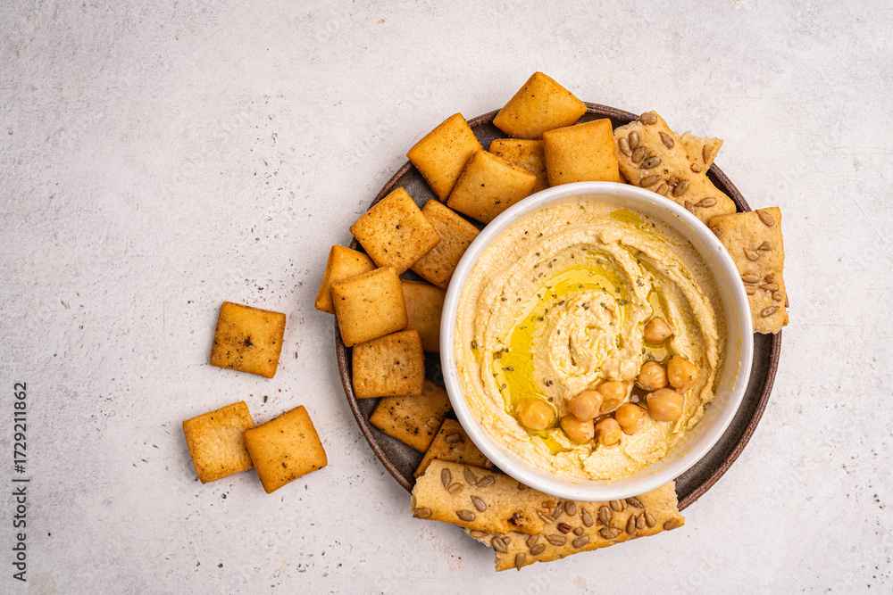 Various hummus dips in different colours. Hummus with dry crackers, top view. Vegan and traditional hummus as healthy and vegan snack.