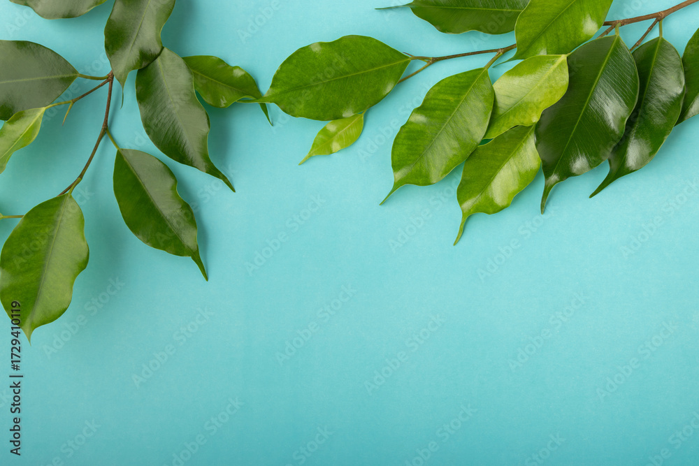 Tropical flat lay ficus benjamina leaves branch on vibrant blue surface background
