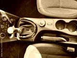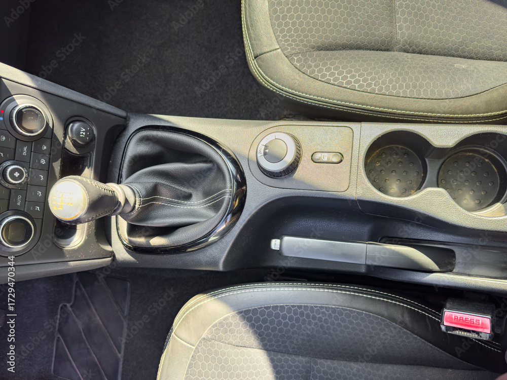 Modern car interior featuring manual transmission gear stick and stylish design with cup holders and control panel