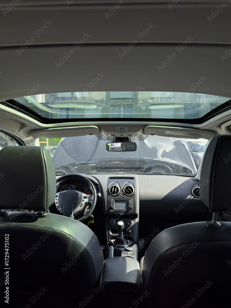 View of a car interior showcasing modern design and spaciousness under a bright sky in an urban setting during midday