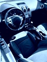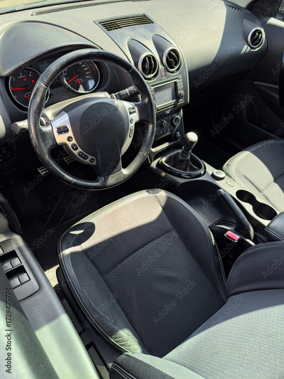 Interior view of a modern car with a manual transmission showing black seats and dashboard details