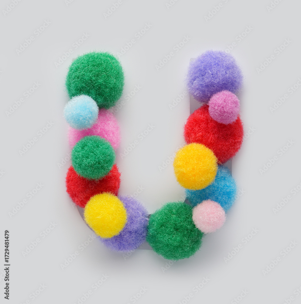 Colorful letter U made of fluffy pom poms on white background. Creative handmade typography for kids learning alphabet, educational design, playful classroom decor, and graphic projects.