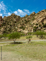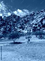Vast rocky landscape with scattered trees basking under a bright blue sky during midday