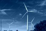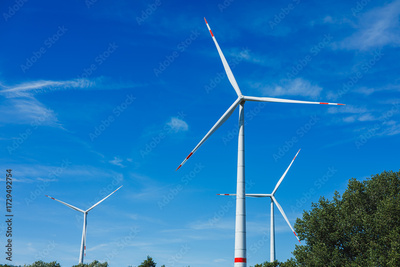 Capturing three large wind turbines against a bright blue sky in a rural landscape during the daytime
