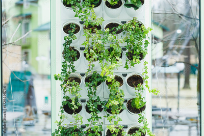 Vertical garden displays lush greenery in a modern urban setting, showcasing innovative gardening techniques and fresh plant life