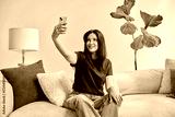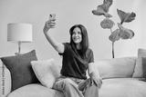 Happy beautiful woman taking selfie portrait on smartphone, at home