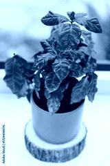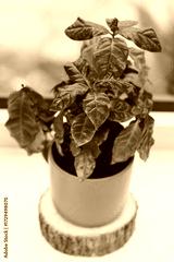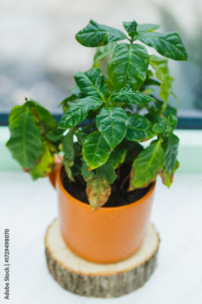 Green coffee plant thriving in a bright room surrounded by natural light and warm wooden accents