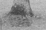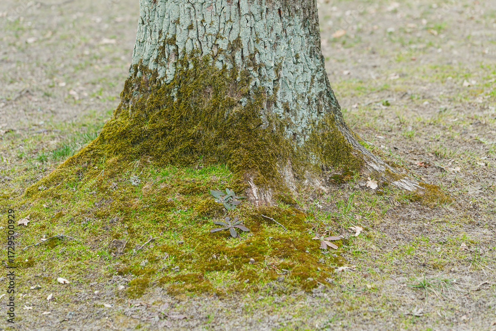 Natural scene of a tree trunk surrounded by green moss and grass in a tranquil outdoor setting during daylight hours