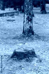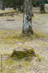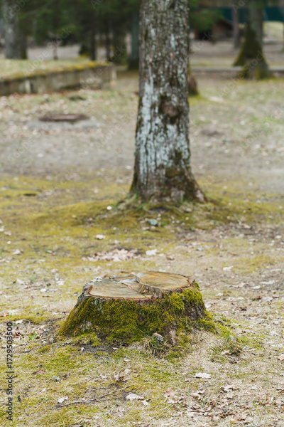 A peaceful forest clearing with a mossy tree stump surrounded by tall trees and soft earth in early spring