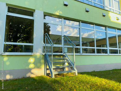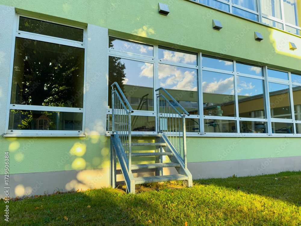 Bright afternoon light enhances the view of blue metal stairs beside a modern building with large glass windows