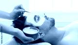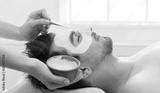 Unshaven man getting facial nourishing mask by beautician at spa salon