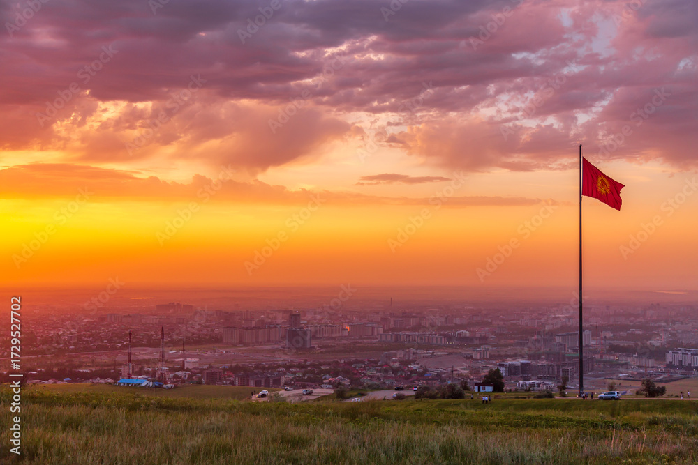 Bishkek city view with highest flagpole with the National flag of Kyrgyzstan on Mount Boz-Boltok during colorful sunset. Bishkek - capital city of Kyrgyzstan.