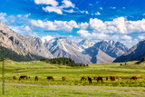 Kyrgyzstan nature landscape. Beautiful green alpine meadows with horses and flowers against Tien-Shan mountains in Kyrgyzstan