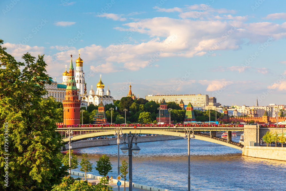 View of Moscow Kremlin, Moscow River and Big Stone bridge during summer sunny day. Landmark in Moscow, Russia.